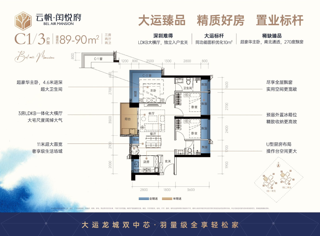 闰悦蓝湾公馆,由深圳市盛悦兴投资有限公司与深圳市爱联股份合作公司共同开发,总占地面积约7420.63㎡,总建筑面积约4.6万㎡,计容建筑面积约3.35万㎡,容积率4.3,绿化率40.01%,共由2栋27-29层高住宅组成,其中1栋1单元住宅29F,1栋2单元住宅27层。