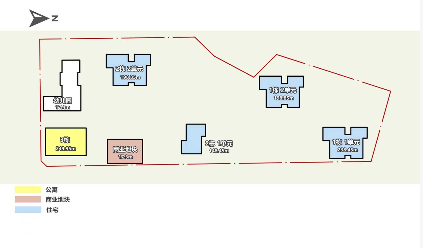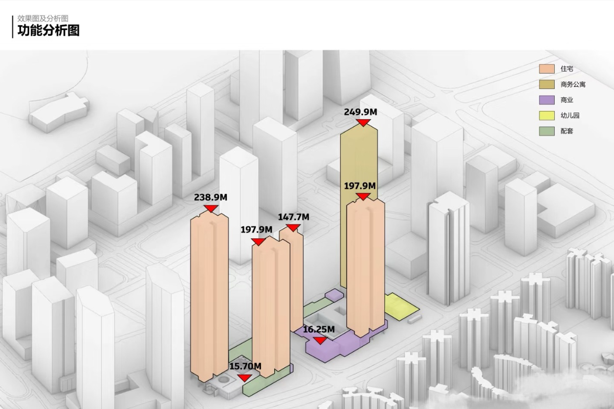 1栋公寓250米,4栋住宅分别150米、200米、200米、240米。层高3.3米,约40-70层(不含底商)。