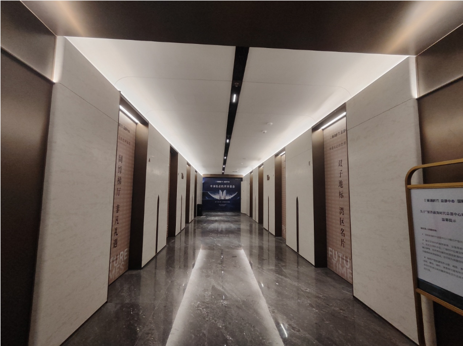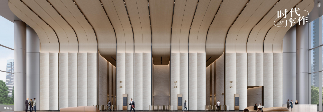 约16.7米首层大堂、约600㎡奢阔尺度,以“前海之帆”为设计概念,融合高端石材、铝材等,构建前海形象之门,引领城市扬帆起航。