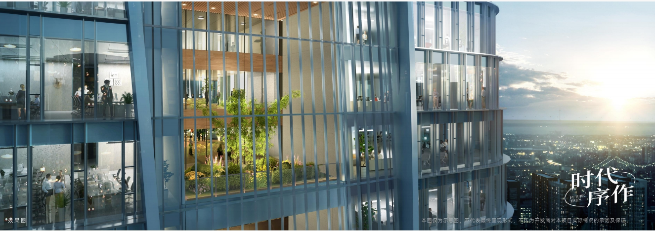以空中花园,营造绿色私密休憩空间,为总部企业菁英,创造垂直绿色商务体验。标准层每三层享有一个面积约120平的空中花园,挑高约13.5米。