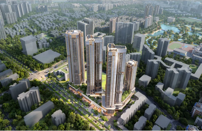 目将规划占地14969㎡,总建面150843㎡,计容建面111267㎡ ,容积率7.43,其中:住宅98754㎡,商业、办公及旅馆业建筑2100㎡,公共配套面积8205㎡。项目有4栋25-46层高住宅组成,还配建一所九年一贯制学校,