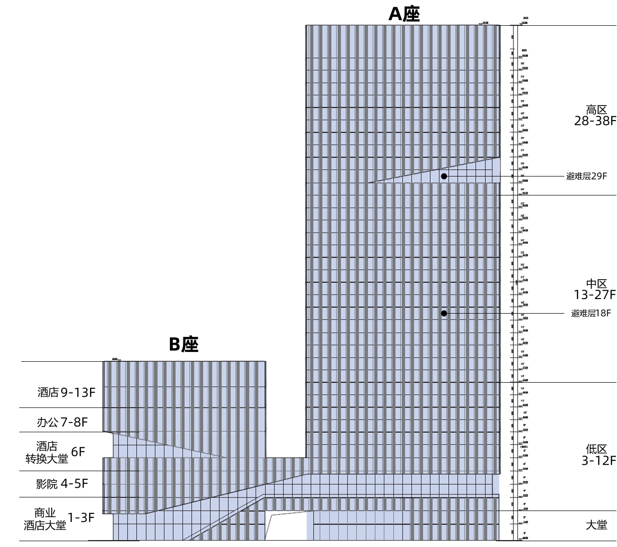 标准层高:2-7层4.5米,8-38层4.2米(净高3米)