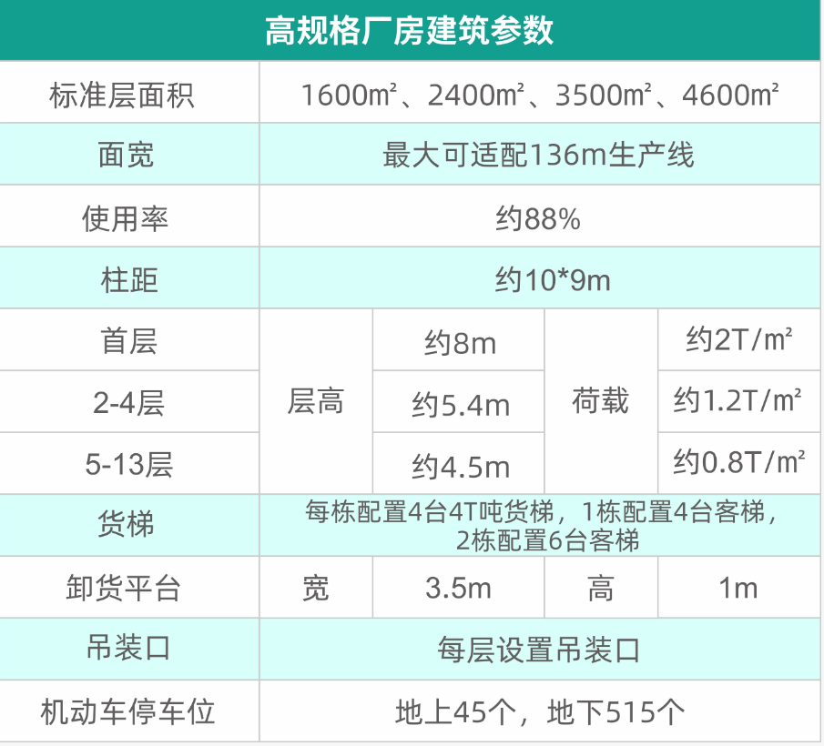 【以需定建 灵活适配】标准层面积2200-4600㎡,首层8m层高,最大可适配136m生产线,10*9m大柱距,4T货梯配置,宽3.5m、高1m卸货平台,货运通路转弯半径12m,大型货车出入无忧。