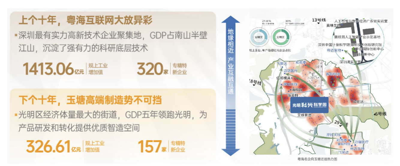 产研结合奠定了粤海街道的成功,玉塘现已汇聚168个科研实验室,20余支院士团队,科研院所人才4400人。通过深圳最强科创中轴线的链接,将加速两地产业、人才的互联