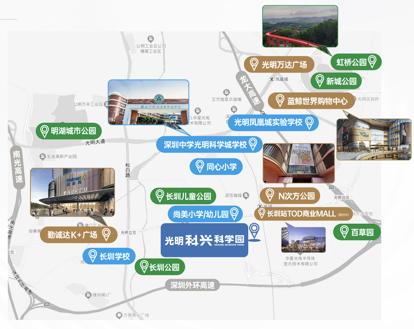 教育/居住配套:配建6万㎡精装居所,400米内两大保障房小区提供超1万套租赁房源。项目西侧毗邻尚美小学,2公里内覆盖深圳中学光明科学城学校、光明凤凰城实验学校、长圳学校、同心小学等多所优质学校