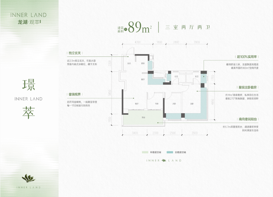 璟萃 建面约89㎡ 三室两厅两卫 超100%实用率 舒适奢阔三房,全屋飘窗高,赠送媲美市面约100㎡空间尺度。 全明奢境视界 四开间全朝南,一线奢居享受,每一寸空间皆向阳而生。 星级主卧套房 约19㎡星级套房,私享品位生活;奢配270°转角飘窗,享极致视野。 南向奢阔阳台 约5.7m双面宽阳台,通透奢居享受,阳光满屋生活场。 创新独立玄关 近2.3m独立玄关,尽显从容;预留内嵌式冰箱位,藏于无形