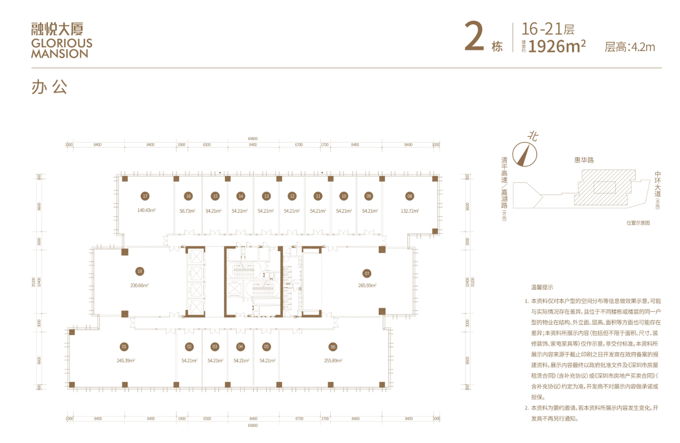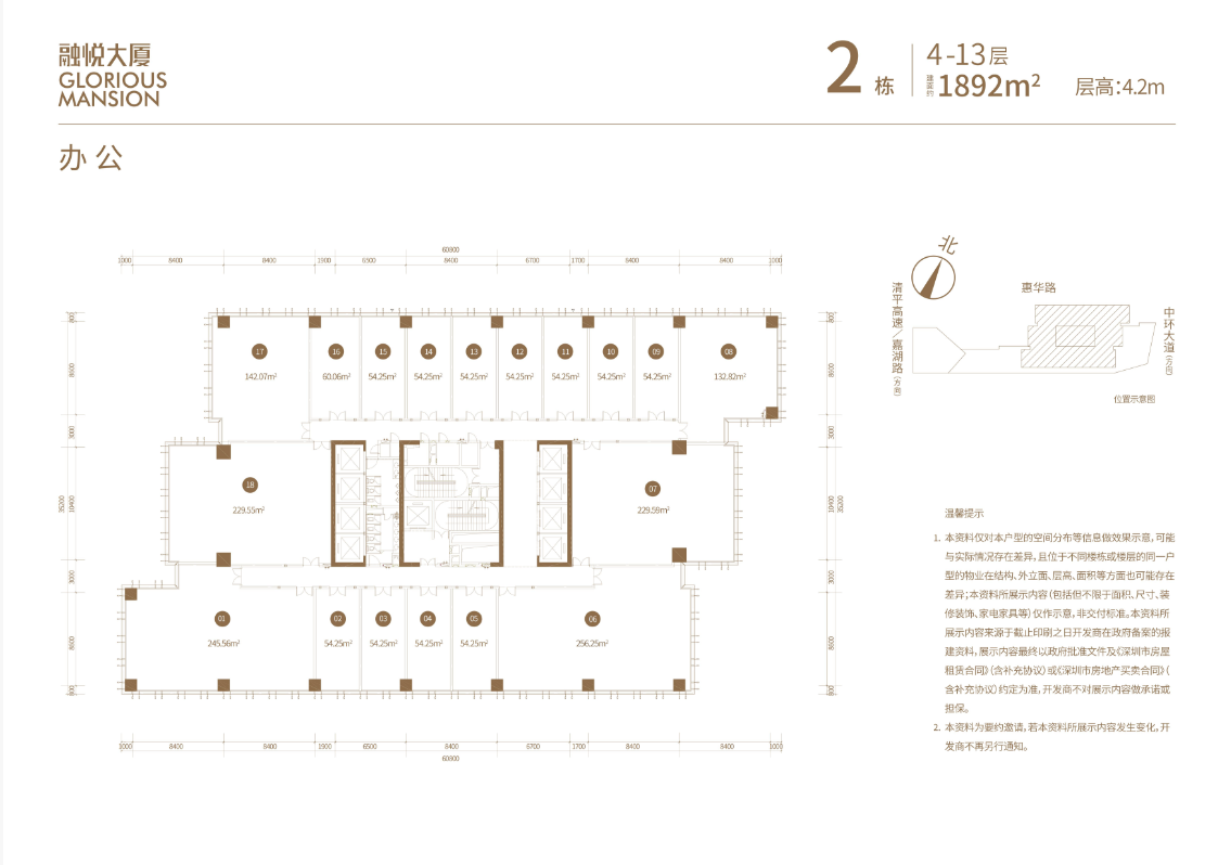 塔楼:共23层(3至23层为办公,共372户 ),办公面积39604.21㎡,标准层面积1837㎡,四面采光,主力户型54-62㎡,次主力户型90-146㎡以及200-300㎡,层高4.2m,荷载200kg/㎡,实用率约75%,毛坯交付。