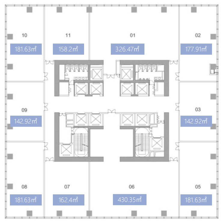 十字电梯厅布局, 享5大展示面,可设置空中大堂与企业前台,完美匹配总部形象。